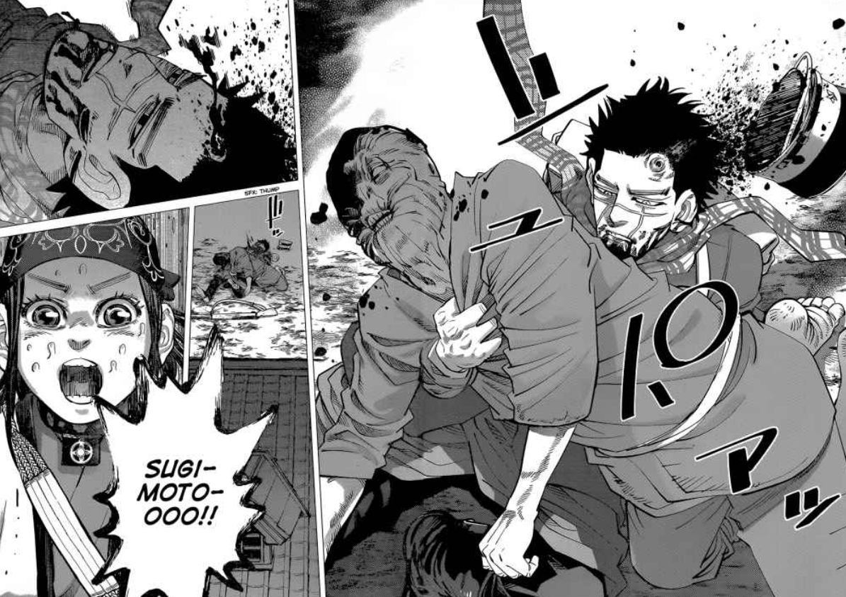 Sugimoto grabs the dead man's body and Ogata shoots him in the head. Even from this far away, he can hear Asirpa crying out the man's name in despair. That's fine. This way she'll have no choice but to hate him.]